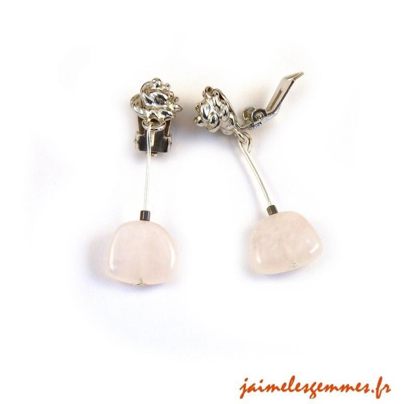 Boucles d'oreille clips en quartz rose composées d'une jolie pierre aux formes arrondies accompagnée d'un fin petit tube facetté en hématite.