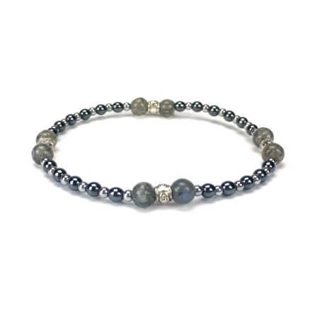 Bracelet fin en labradorite et hématite rehaussée avec des perles facettées en hématite facettées argentées.